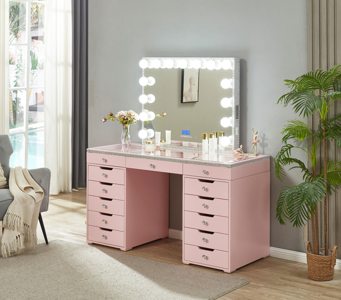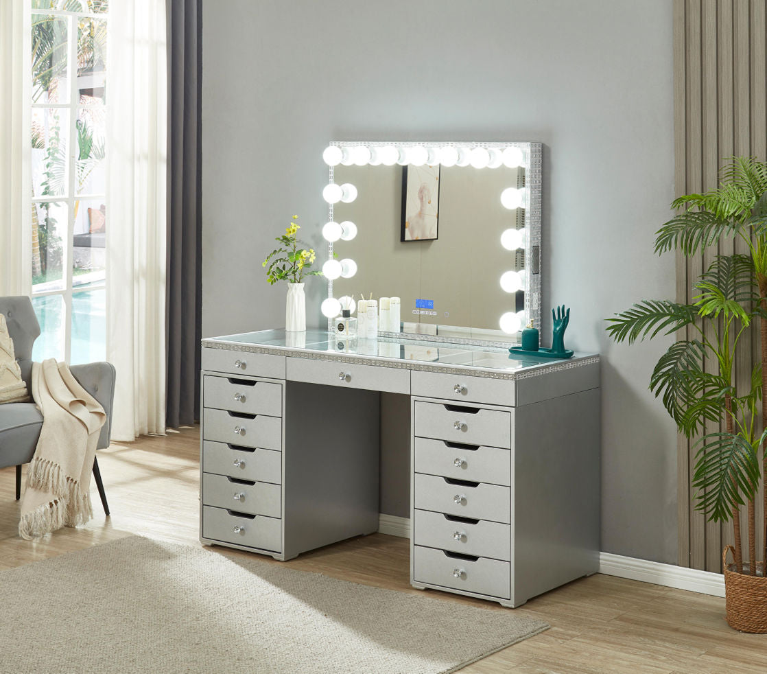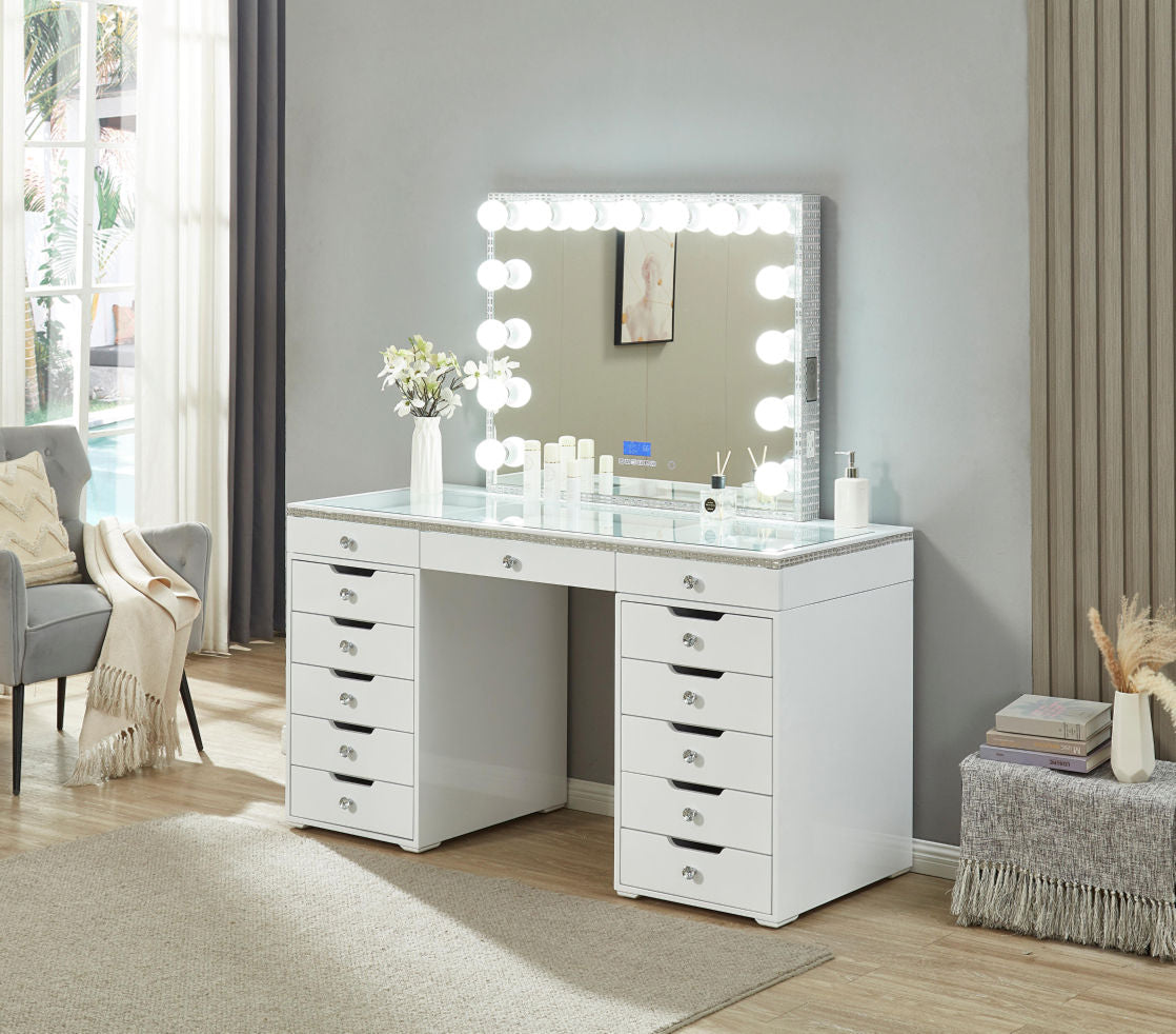 Elegant 13-Drawer Vanity Dressing Table with Crystal-Adorned Smart Makeup Mirror [LR-004-Crystal]