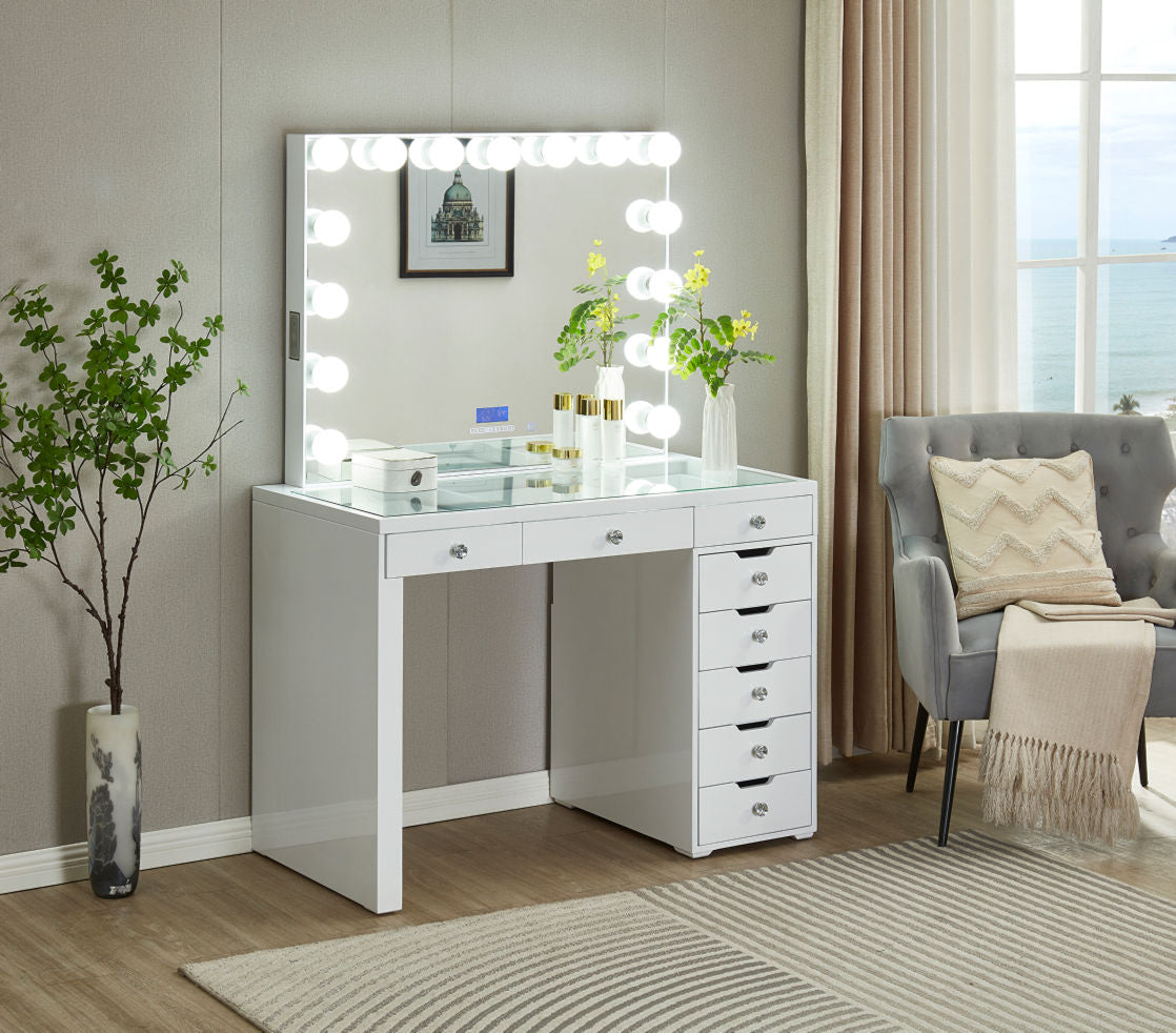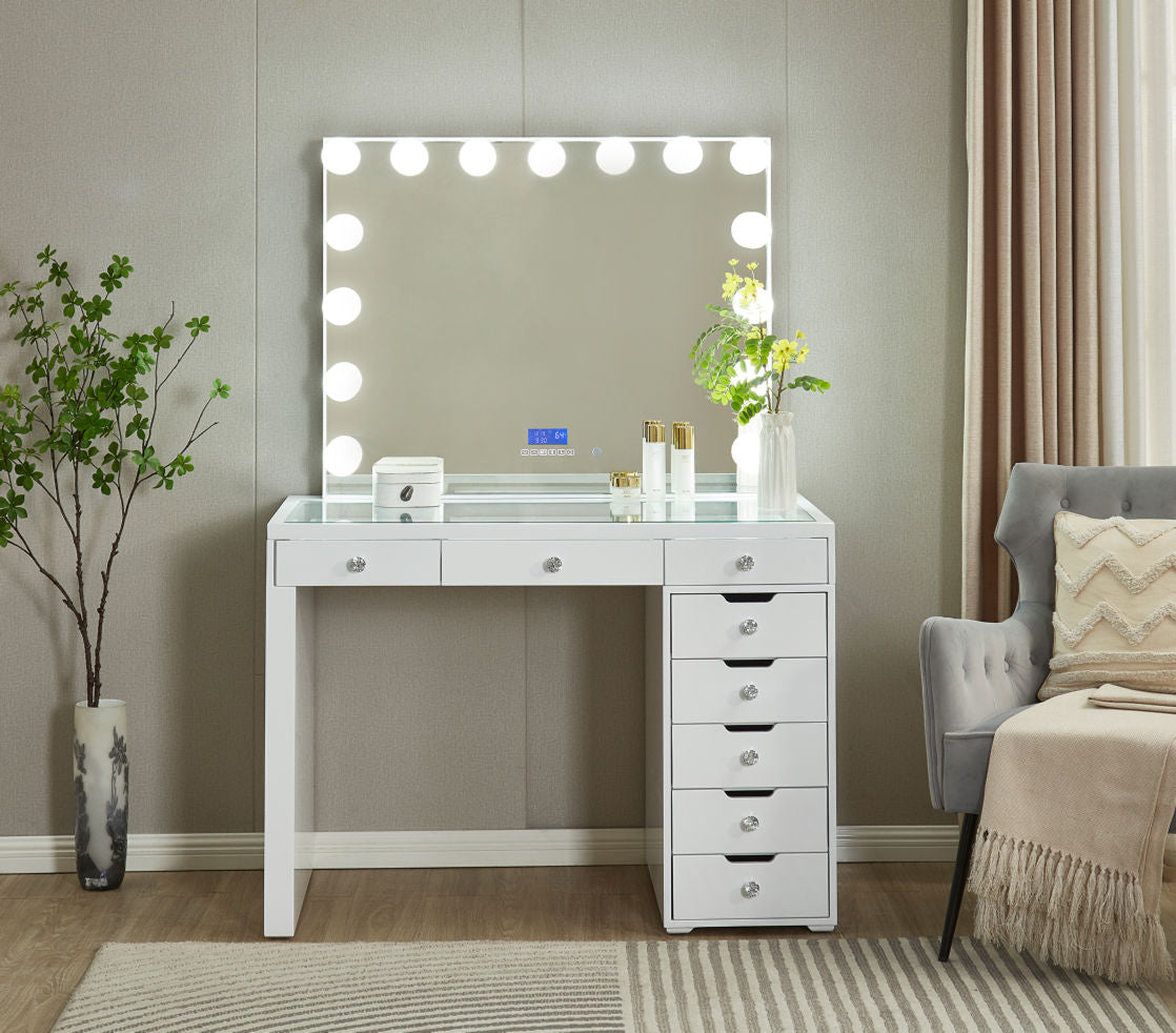 Dreamy Vanity Experience: 8 Lit - up Drawers, Shiny Tempered Glass, 15 LED Mirror & Bluetooth Magic [LR-026]