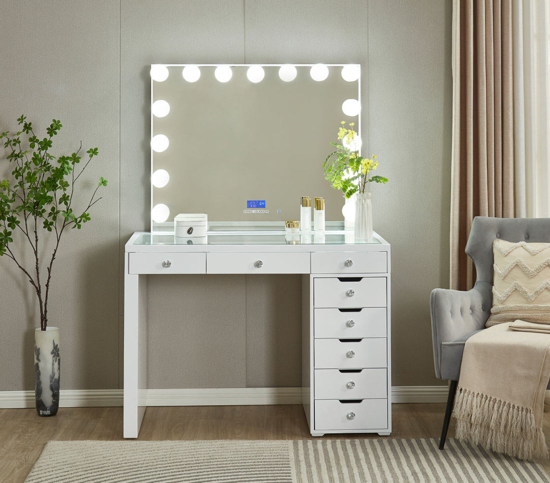 1. Unique Vanity: 8 Lit Drawers, Drawer - front Mirrored Design, Tempered Glass & LED - Bluetooth Mirror[LR-027]